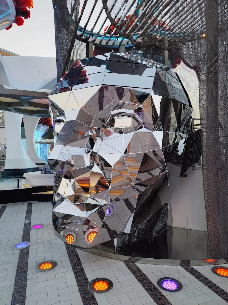 A standout sculptural piece, the DJ booth was custom made by SPME in 3D-formed stainless steel, shaped like a contemporary skull. Polished to a mirror finish, it anchors the entertainment zone with a bold visual presence, doubling as a functional DJ station and art installation.