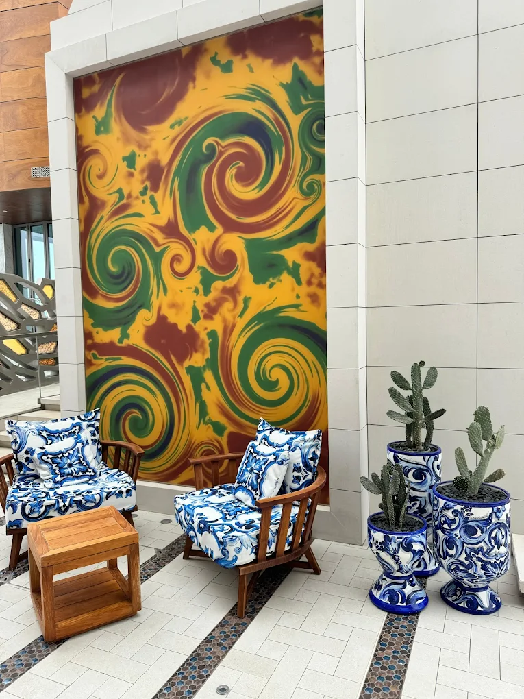 A series of decorative trumpet-shaped installations were added to enrich the atmosphere. These multifunctional pieces emit soft ambient light and a gentle mist, creating a cooling effect and contributing to the sensorial luxury of the space.